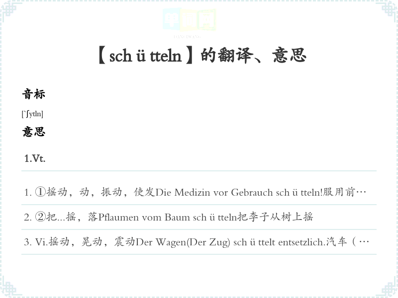 Vi.摇动,晃动,震动Der Wagen(Der Zug) schüttelt entsetzlich.汽车(火车)晃得厉害。