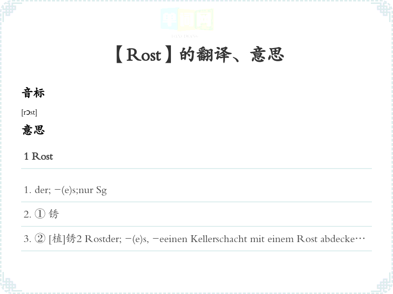 ② [植]锈2 Rostder; -(e)s, -eeinen Kellerschacht mit einem Rost abdecken, damit niemand hineinfällt把放在井口,以免有人掉下去einen Rost über ein Feuer legen und darauf Würstchen braten把放在火上,并在上面烤小香肠