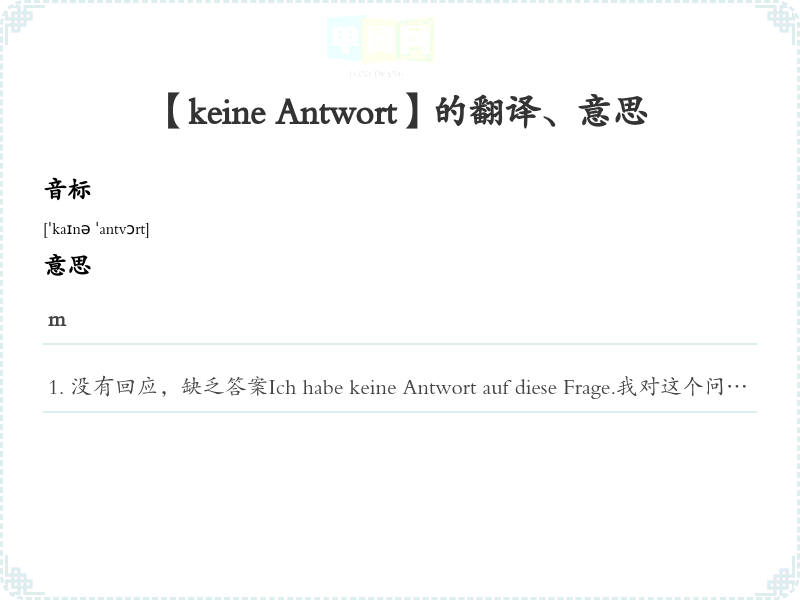 没有回应,缺乏答案Ich habe keine Antwort auf diese Frage.我对这个问题没有答案。不回答的状态Er gab mir keine Antwort.他没有给我回答。