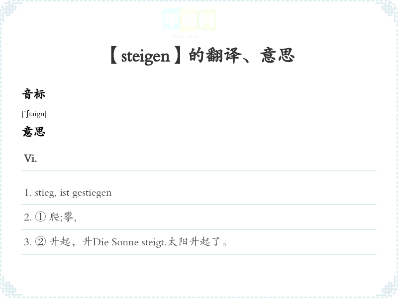 ④ 升高,升,涨Das Blut steigt ihm ins Gesicht.血涌他的脸。Der Duft der angebratenen Zwiebeln stieg ihr in die Nase.煎洋葱的香味传入了她的鼻子。