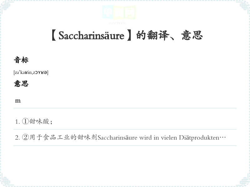 ②用于食品工业的甜味剂Saccharinsäure wird in vielen Diätprodukten verwendet. 甜味酸被用于许多减肥产品中。