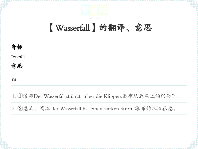 ①瀑布Der Wasserfall stürzt über die Klippen.瀑布从悬崖上倾泻而下。