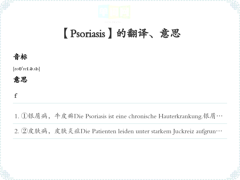 ②皮肤病,皮肤炎症Die Patienten leiden unter starkem Juckreiz aufgrund der Psoriasis.患者因银屑病而饱受严重的瘙痒。