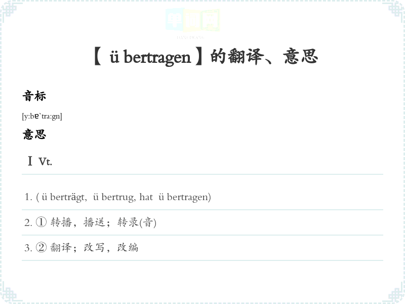 ⑤ 把...传染给Ⅱ Vr.传布,传染,染Die Tollwut kann sich auch auf Menschen übertragen.狂犬病可以传染到人身上。Ihre Begeisterung übertrug sich auf ihre Kollegen.她的染了她的同事们。Ⅲ übertragen P.Ⅱ转义的,借用的