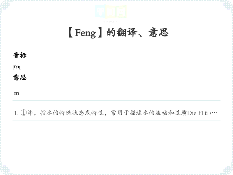 ①沣,指水的特殊状态或特性,常用于描述水的流动和性质Die Flüsse fließen mit starkem Feng.河流流动迅猛。