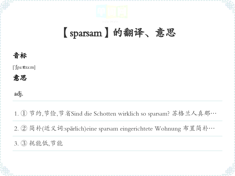 ② 简朴(近义词:spärlich)eine sparsam eingerichtete Wohnung 布置简朴住房