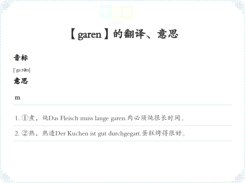 ①煮,炖Das Fleisch muss lange garen.肉必须炖很长时间。