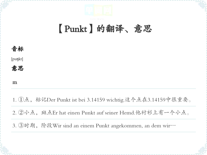 ②小点,斑点Er hat einen Punkt auf seiner Hemd.他衬衫上有一个小点。
