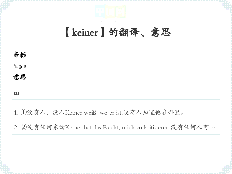 ①没有人,没人Keiner weiß, wo er ist.没有人知道他在哪里。