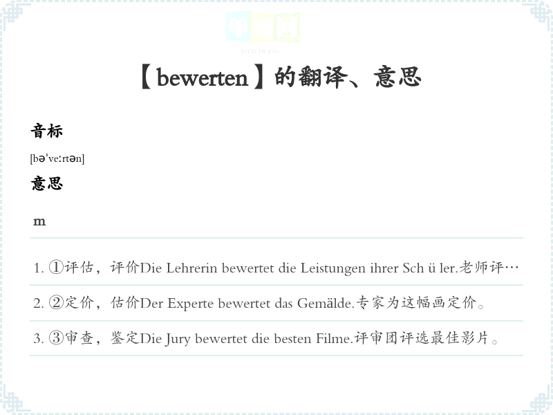 ①评估,评价Die Lehrerin bewertet die Leistungen ihrer Schüler.老师评估她的学生的表现。