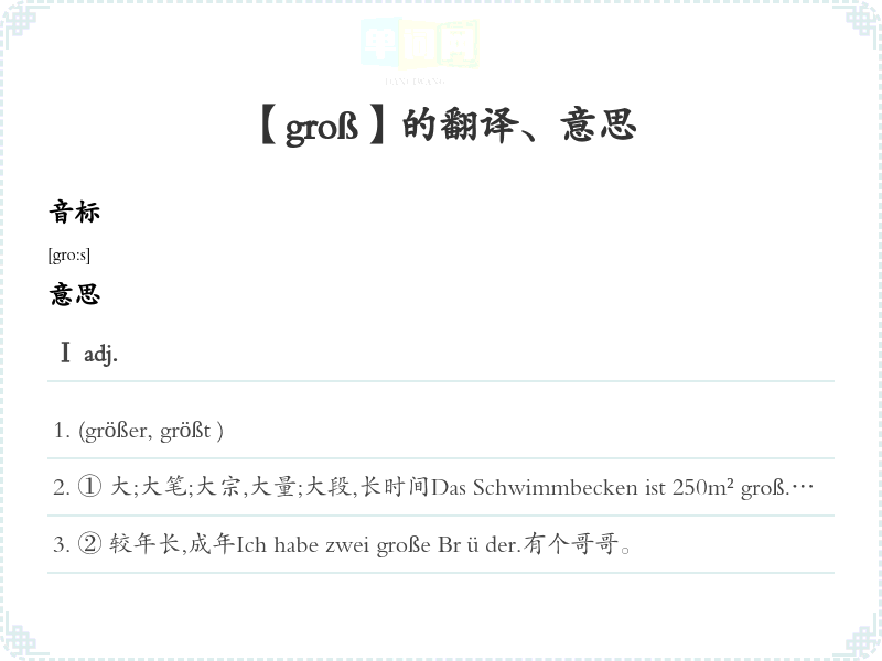① 大;大笔;大宗,大量;大段,长时间Das Schwimmbecken ist 250m² groß.泳池有250平米大。Mein Bruder ist einen Meter achtzig groß.兄弟身一米八。Der große Zeiger der Uhr zeigt die Minuten an, der kleine die Stunden.长针指示钟,短针指示小时。Der Elefant ist ein großes Tier.大象是一种很大动物。