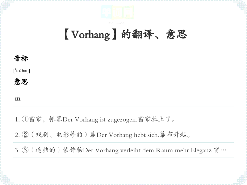 ①窗帘,帷幕Der Vorhang ist zugezogen.窗帘拉上了。