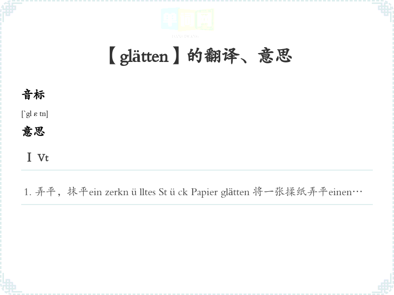 弄平,抹平ein zerknülltes Stück Papier glätten 将一张揉纸弄平einen zerknitterten Stoff mit dem Bügeleisen glätten 将布料用熨斗烫平Ⅱ Vr变得平滑,平静Nach dem Sturm beginnt sich das Meer zu glätten. 暴风雨过后,大海开始平静下来。Die Wogen haben sich geglättet. 怒气平息了。语法搭配sich+四格, +四格