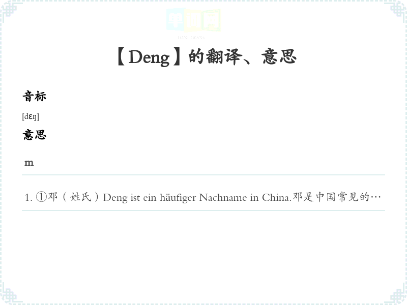 ①邓(姓氏)Deng ist ein häufiger Nachname in China.邓是中国常见的姓氏。