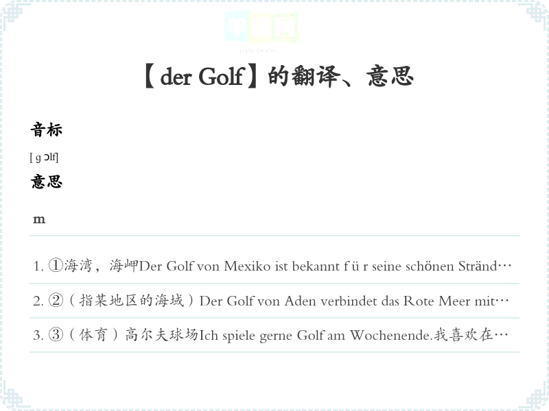③(体育)高尔夫球场Ich spiele gerne Golf am Wochenende.我喜欢在周末打高尔夫。