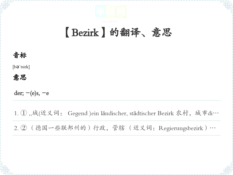 ① ,,域(近义词: Gegend )ein ländischer, städtischer Bezirk 农村,城市die Kunden eines Bezirks betreuen 接待(照料)客户