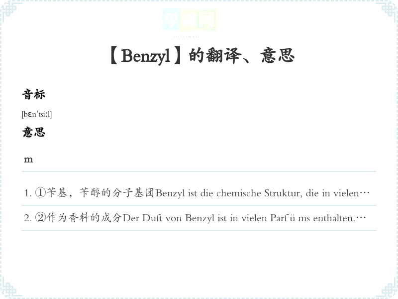 ②作为香料的成分Der Duft von Benzyl ist in vielen Parfüms enthalten.苄的香气在许多香水中都有。