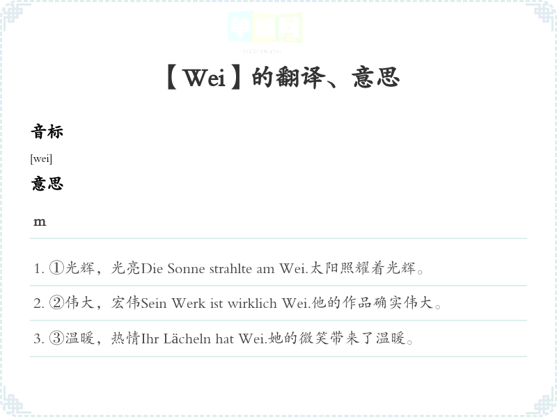 ②伟大,宏伟Sein Werk ist wirklich Wei.他的作品确实伟大。