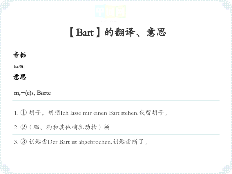 ① 胡子,胡须Ich lasse mir einen Bart stehen.我留胡子。