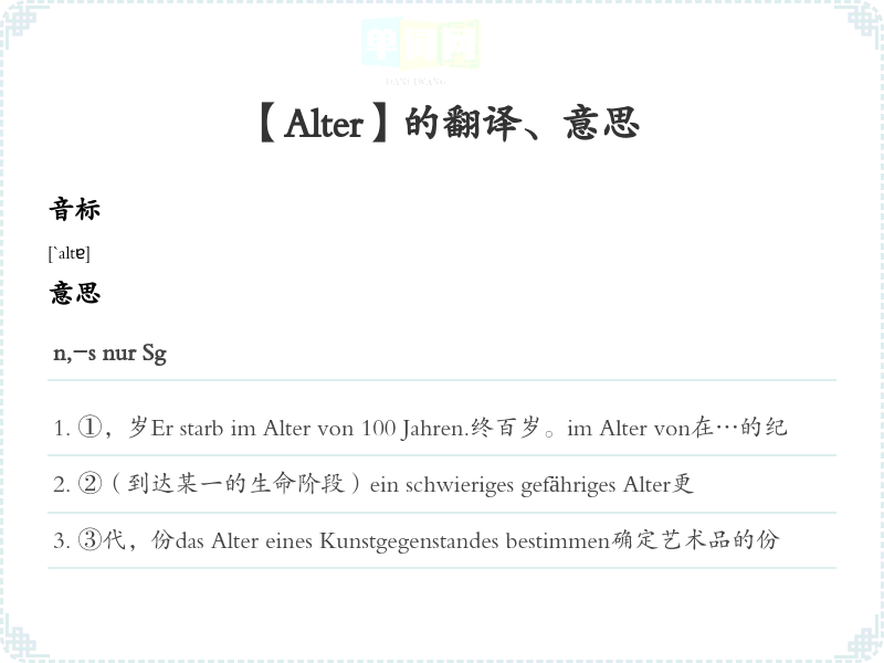 ⑥(集合名词)老人↔Jugendein biblisches Alter高寿ein Mann in beste Alter精壮Alter schützt vor Torheit nicht.人老非圣贤,孰能无过。 www.godic.net 版 权 所 有