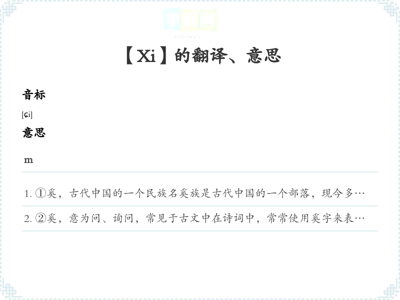①奚,古代中国的一个民族名奚族是古代中国的一个部落,现今多用于文化或历史的讨论。