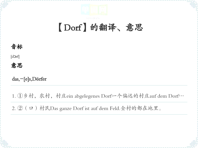 ①乡村,农村,村庄ein abgelegenes Dorf一个偏远的村庄auf dem Dorf wohnen住在农村