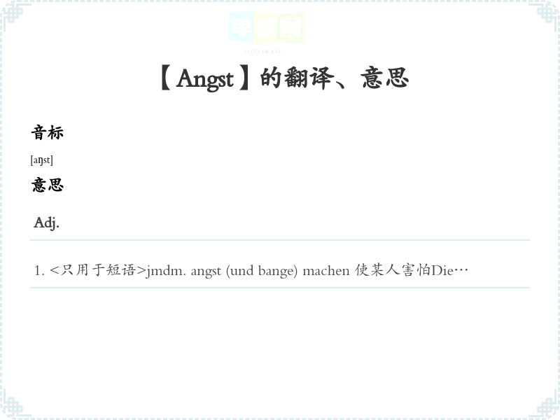 <只用于短语>jmdm. angst (und bange) machen 使某人害怕Die Ausweglosigkeit hat ihr Angst gemacht.找不到出路使她十分担忧。只用于短语>