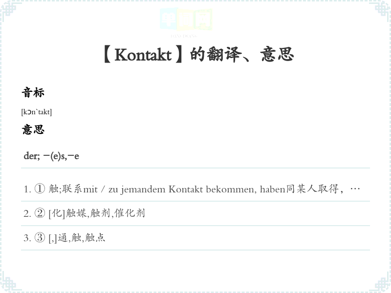 ① 触;联系mit / zu jemandem Kontakt bekommen, haben同某人取得,有联系(den) Kontakt aufnehmen, den Kontakt abbrechen, aufgeben, verlieren 建立,中断,放弃,失去联系Er ist sehr schüchtern und hat deswegen kaum Kontakt mit / zu seinen Mitschülern.很腼腆和同学几乎没有触。