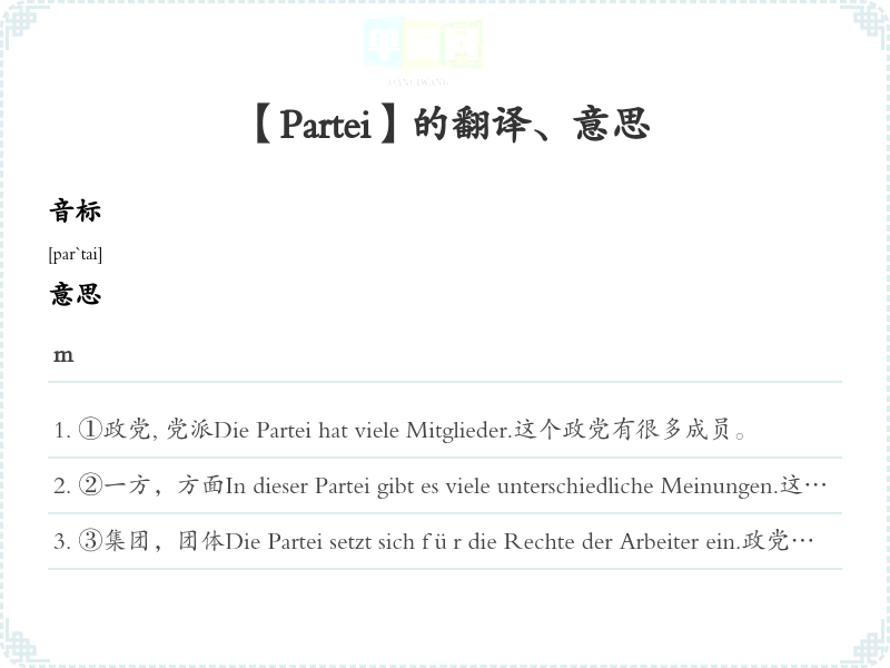 ①政党, 党派Die Partei hat viele Mitglieder.这个政党有很多成员。