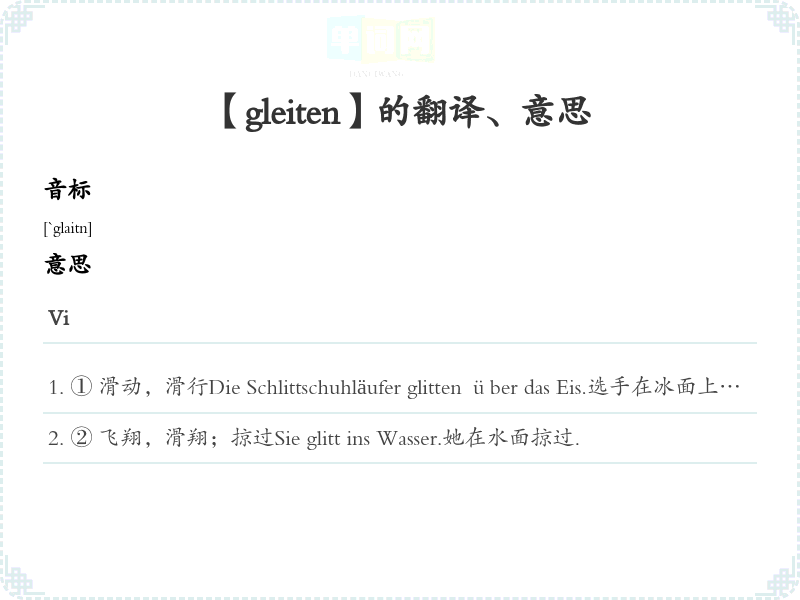 ② 飞翔,滑翔;掠过Sie glitt ins Wasser.她在水面掠过.