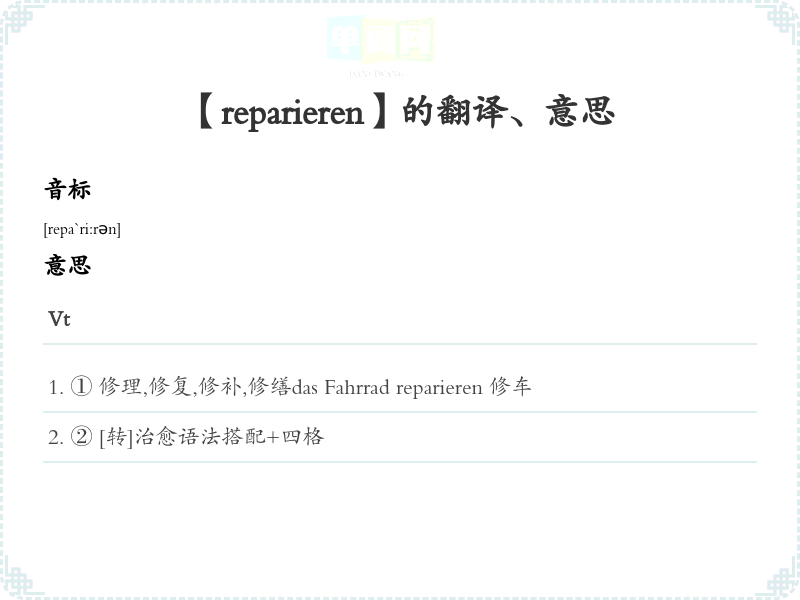 ① 修理,修复,修补,修缮das Fahrrad reparieren 修车
