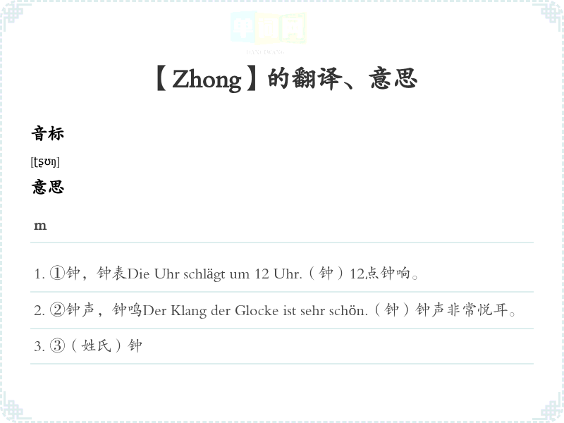 ②钟声,钟鸣Der Klang der Glocke ist sehr schön.(钟)钟声非常悦耳。