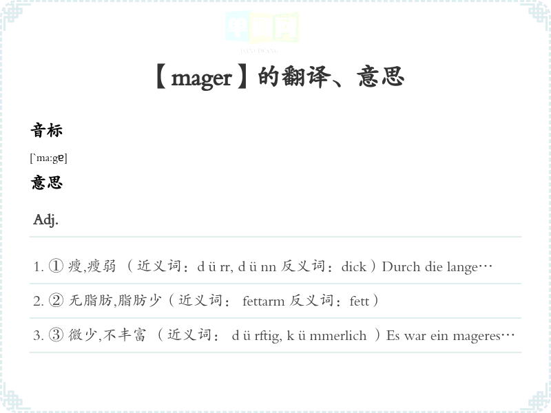 ① 瘦,瘦弱 (近义词:dürr, dünn 反义词:dick)Durch die lange Krankheit ist sie sehr mager geworden.因长期生病她很瘦弱。
