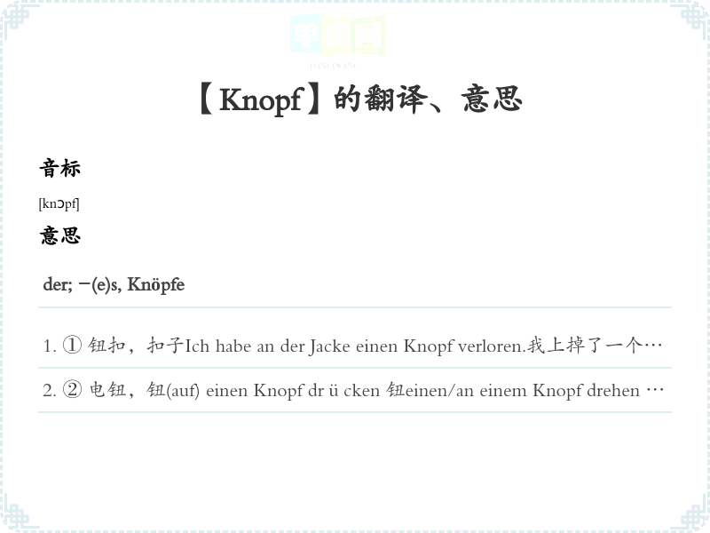 ① 钮扣,扣子Ich habe an der Jacke einen Knopf verloren.我上掉了一个纽扣。An deinem Hemd ist ein Knopf offen.衬衣上有一个纽扣没扣好。