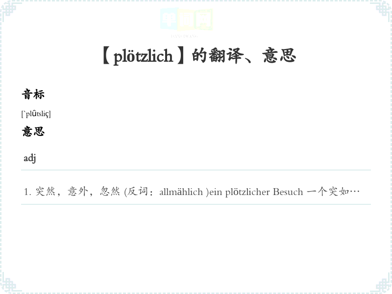 突然,意外,忽然 (反词:allmählich )ein plötzlicher Besuch 一个突如其来访问Sein plötzlicher Entschluss, nach Amerika auszuwandern, hat uns alle sehr traurig gemacht.他突然决定移居美国,使我们很难过。Ich erschrak, als der Hund plötzlich zu bellen anfing.狗突然狂吠,我吓了一跳。
