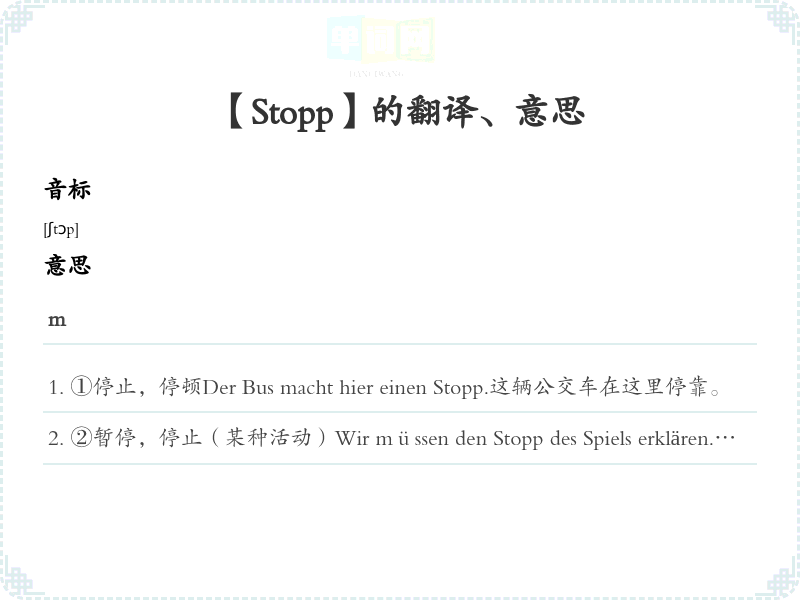 ①停止,停顿Der Bus macht hier einen Stopp.这辆公交车在这里停靠。