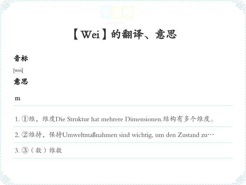 ①维,维度Die Struktur hat mehrere Dimensionen.结构有多个维度。