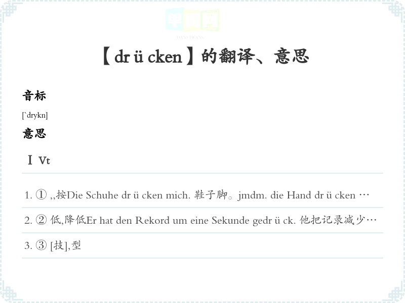 ① ,,按Die Schuhe drücken mich. 鞋子脚。jmdm. die Hand drücken 和某人握手den Daumen drücken [口]祝愿某人成功Knopf drücken 按电钮