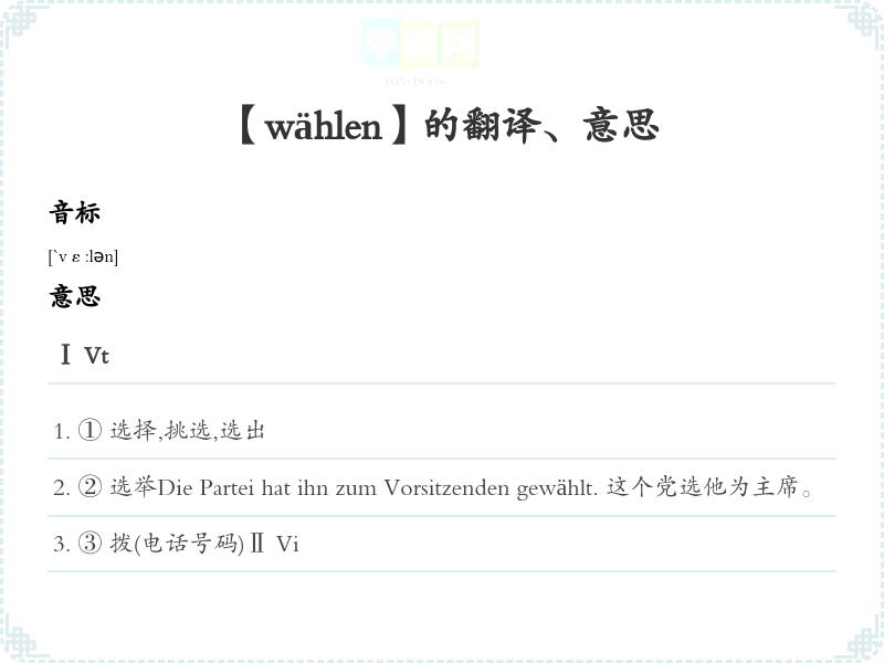 ① 选择,挑选,选Haben Sie schon gewählt? 您点餐了吗?