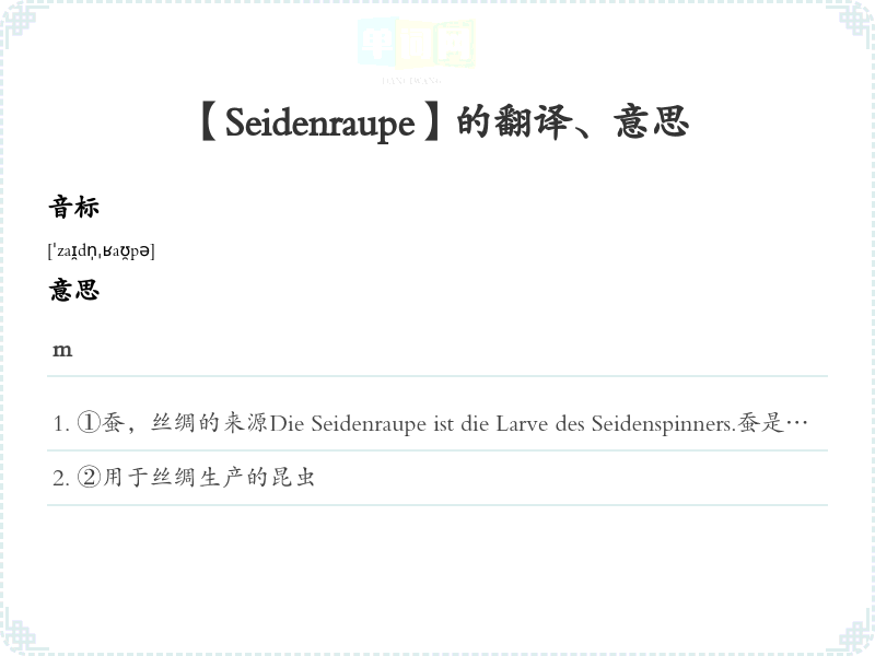 ①蚕,丝绸的来源Die Seidenraupe ist die Larve des Seidenspinners.蚕是家蚕的幼虫。