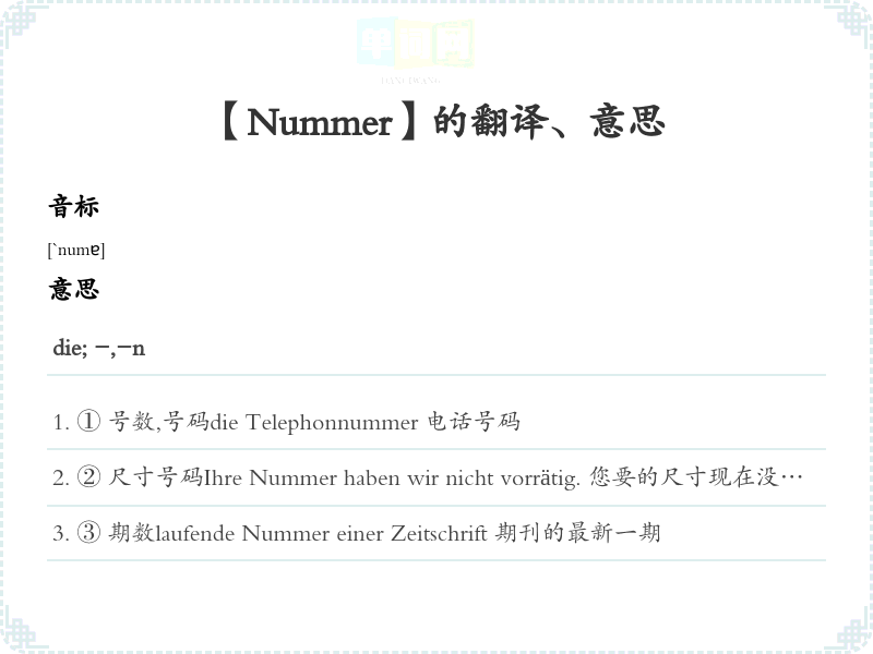 ⑤ 分数In der Prüfung hat er eine schlechte Nummer bekommen. 他的考试成绩很糟糕。
