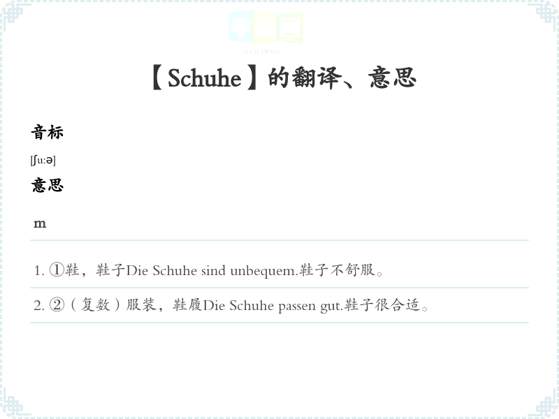 ①鞋,鞋子Die Schuhe sind unbequem.鞋子不舒服。
