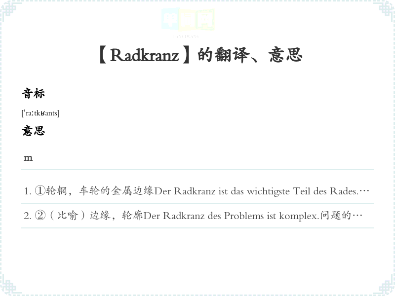 ②(比喻)边缘,轮廓Der Radkranz des Problems ist komplex.问题的边缘很复杂。