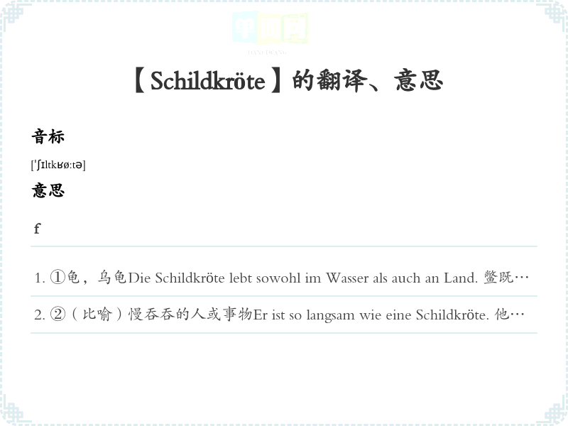 ②(比喻)慢吞吞的人或事物Er ist so langsam wie eine Schildkröte. 他慢得像个乌龟。