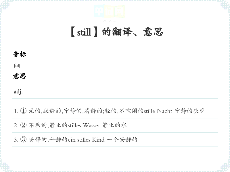 ① 无的,寂静的,宁静的,清静的;轻的,不喧闹的stille Nacht 宁静的夜晚