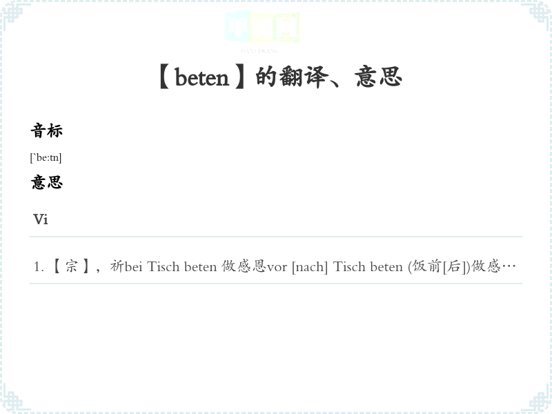【宗】,祈bei Tisch beten 做感恩vor [nach] Tisch beten (饭前[后])做感恩für j-n beten 某人祈um ( für) etw.(A) beten 某事所祈zu Gott beten 向上帝语法搭配+四格, zu+三格, um+四格, für+四格