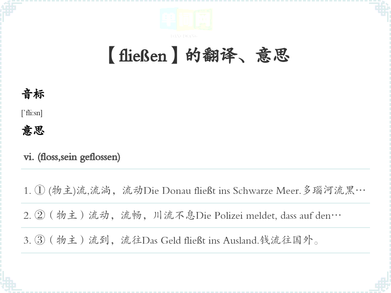 ②(物主)流动,流畅,川流不息Die Polizei meldet, dass auf den Autobahnen der Verkehr ungehindert fließt.警方报道:高速公路交通畅通无阻。