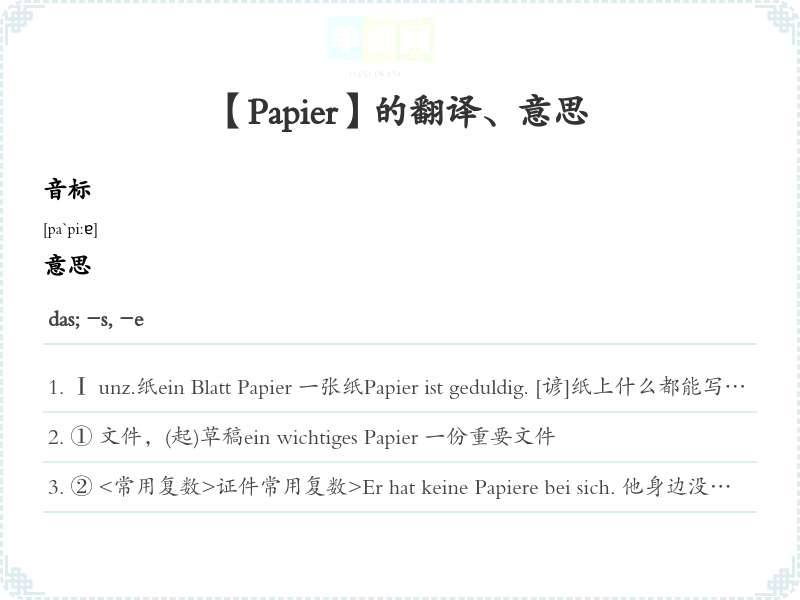 纸ein Blatt Papier 一张纸Papier ist geduldig. [谚]纸上什么都能写。(但不都)Das steht nur auf dem Papier. 这不过一纸空文。etw.(A.) zu Papier bringen 记录某事,把某事用文字写下Ⅱ zählb.