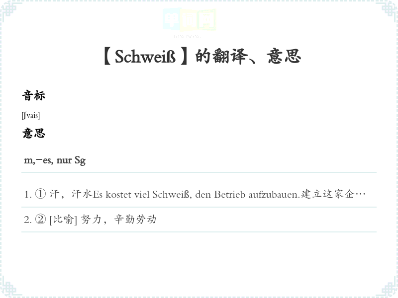 ① 汗,汗水Es kostet viel Schweiß, den Betrieb aufzubauen.建立这家企业花费了很多心。im Schweiße seines Angesichts满头大汗地,汗流浃的