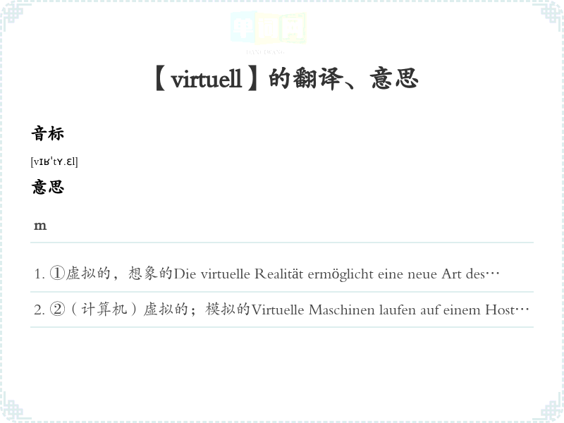 ①虚拟的,想象的Die virtuelle Realität ermöglicht eine neue Art des Spielens.虚拟现实提供了一种新的游戏方式。